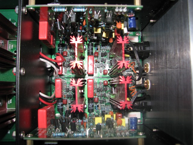 Celkové prevedenie koncáka je na celokovovej ! úrovni v masívnom prevedení, čomu napovedá aj veľká hĺbka prístroja až 53cm. Tranzistroy Sanken 8x A1386A a 8x C3519A, početné osadenie MKP audio kondenzátormi aj v napájacích cestách.